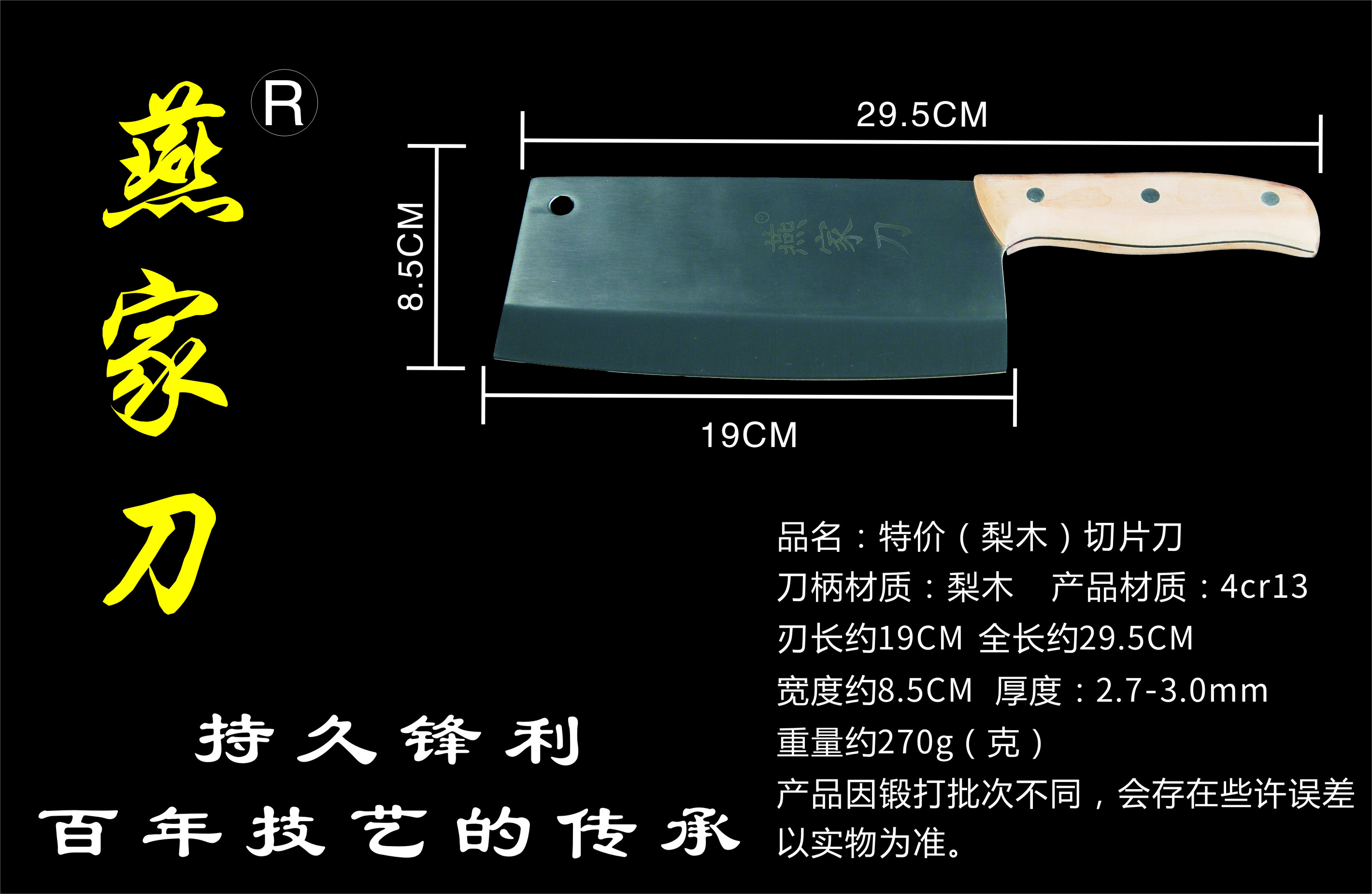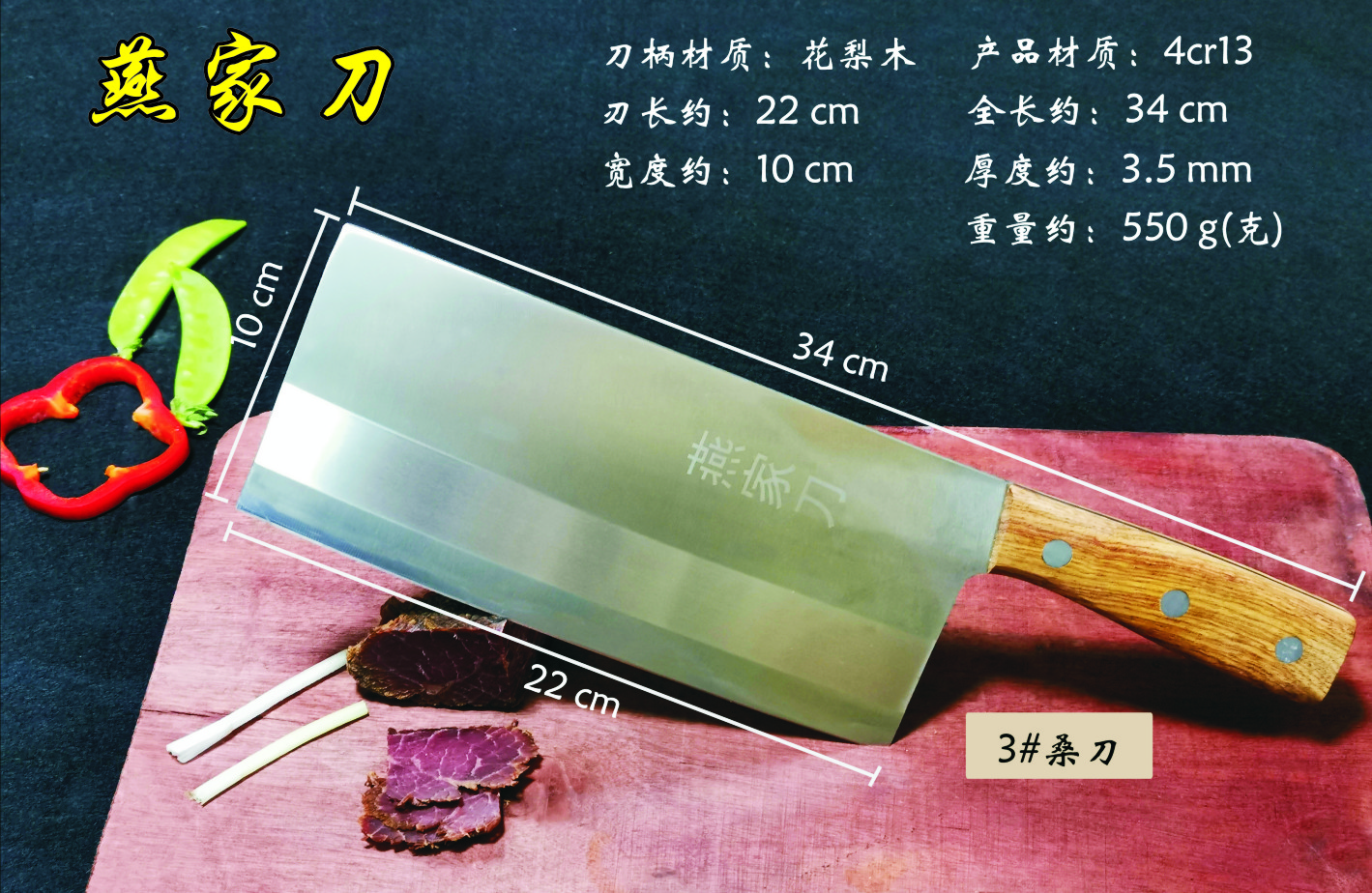 樂山燕家刀具有限公司(公司前身為燕佳鐵匠鋪),公司坐落于美麗的佛都之鄉樂山嘉州,在全國各地有上千家代理經銷點,公司專業(yè)銷售、設計、制作各類刀具。秉承一貫鍛造三精要求,即選料精、用料精、工藝精。所選材料全部產自滇東鐵礦優(yōu)產區。本品牌刀具堅持千挑萬選為材,千錘百煉為刀的手工鍛造工藝宗旨。具有鋒利耐磨、持久耐用,用料上乘,硬度高、韌度強的特點!